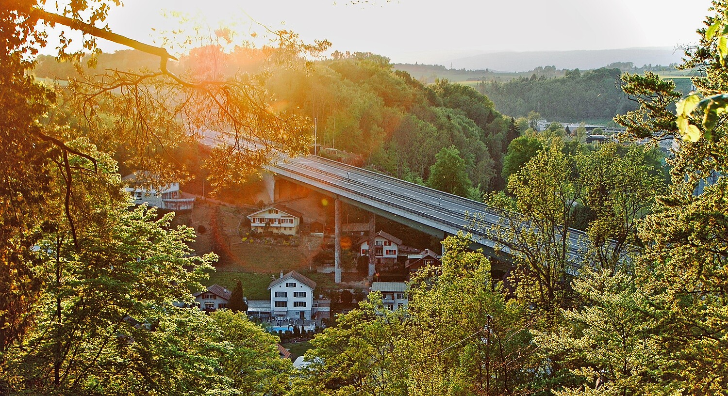 Gemeindepräsident Andreas Freiburghaus: Wir haben ein spezielles Wahrzeichen: die Autobahnbrücke, die sich seit 50 Jahren über das Dorf Flamatt (FR) spannt. Beim Bau wurde die Brücke damals sehr kontrovers diskutiert; heute ist sie akzeptiert.
