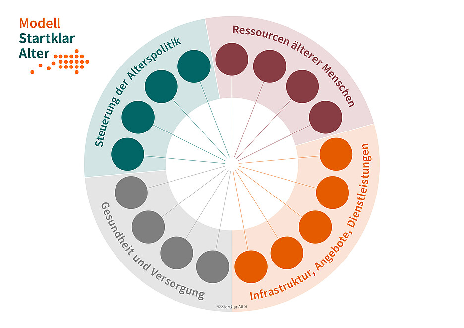 Um die Gemeinden und andere Akteure dabei zu unterstützen, den Umgang mit der demografischen Veränderung proaktiv zu gestalten, wurde «Startklar Alter» entwickelt. Die kompakte, praxisnahe Weiterbildung richtet sich an Einzelpersonen und Gremien. Dabei steht der gelingende Alltag von alten Menschen beim eigens entwickelten «Startklar Alter»-Modell im Fokus. Das Modell unterscheidet vier Bereiche mit je unterschiedlichen Akteuren: Im ersten Bereich geht es darum, was ältere Menschen selbst zu einem gelingenden Alltag beitragen können. Im zweiten Bereich sind es Akteure, die ihre Dienstleistungen kommerziell oder als soziale Angebote bereitstellen. Der dritte Bereich spricht das Gesundheitswesen an und der vierte Bereich die Politik.