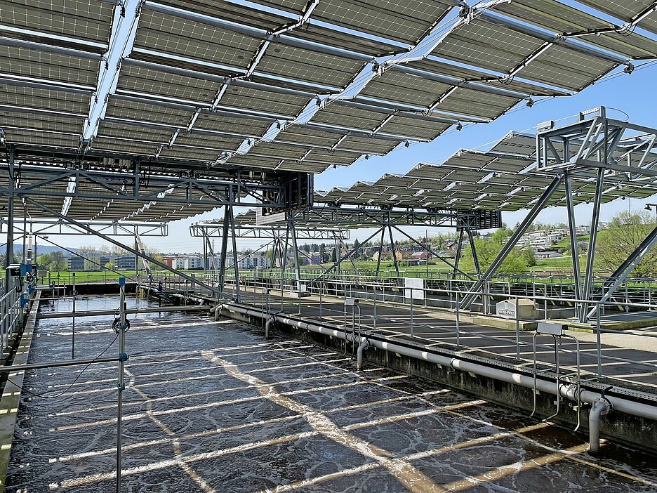 Wenn die Sonne scheint, ist das Markenzeichen der Abwasserreinigungsanlage (ARA) Eich im Süden von Bassersdorf (ZH) schon von Weitem zu erkennen. Auf einer Fläche von 3423 Quadratmetern überdecken 1024 Solarmodule in gut vier Metern Höhe die zwei betonierten Becken zur biologischen Reinigung des Abwassers. Ihre seitlichen Beckenkronen dienen als Fundament für die tragende Metallkonstruktion.