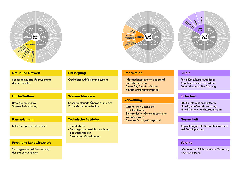 Bei Gesprächen mit Gemeinden zeigte sich, dass es hilfreich ist, die sechs Bereiche des Smart-City-Rads so darzustellen, dass die Zuständigkeiten und Ressorts auf Ebene einer Verwaltungseinheit (Stadt, Gemeinde, Kanton) mit all ihren täglichen Themen abgebildet werden können. Die Grafiken sollen dabei helfen, den Sachverhalt darzustellen. Die gewählte Darstellung sorgt dafür, dass sich betroffene Organisationen in der Thematik schnell wiederfinden und das sonst recht abstrakte Thema greifbar wird. Ferner wird durch die Darstellung deutlich, dass Technologie zwar zukünftig eine immer wichtigere Rolle spielt, aber es bei Smart City um Prozesse und die Organisation geht.