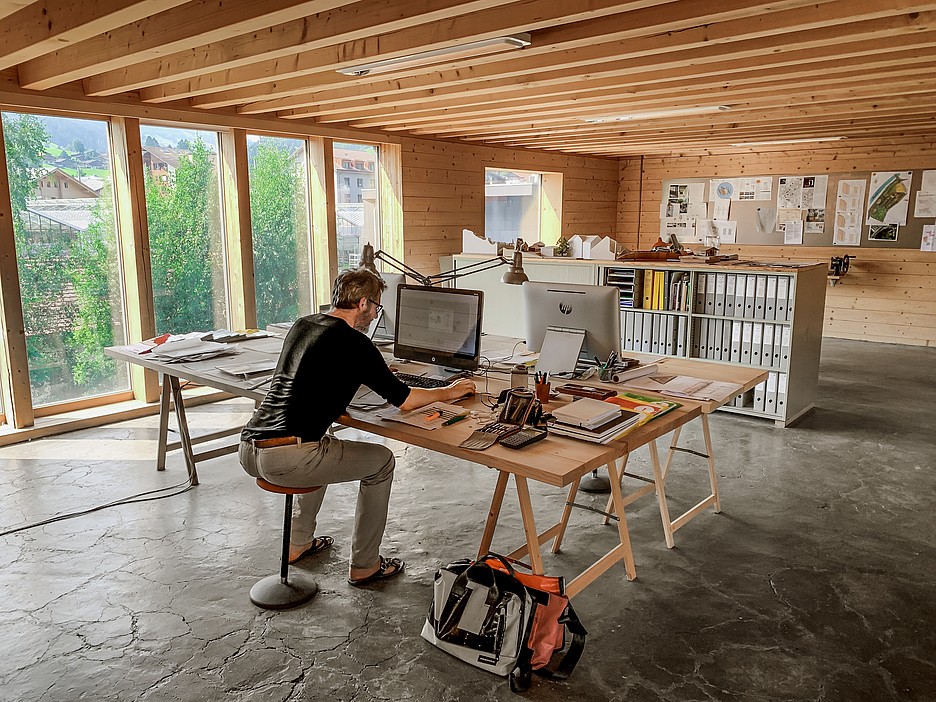 Ob sie denn häufig frieren oder schwitzen würden, will der Besucher wissen. Die Frage muss Sascha Schär schon oft gehört haben, aber er erklärt geduldig und engagiert, wie es funktioniert, dass ihr Gebäude sommers wie winters angenehm temperiert ist, auch auf dieser Höhe, auch in diesem Klima. Zum einen, so Schär, hätten sie ihr Haus auf den Sonnenstand ausgerichtet und die Fenster entsprechend in den Fassaden platziert. Zum anderen verliessen sie sich auf die thermischen Eigenschaften von Beton, Fichtenholz und Stampflehm. «Wir bauen mit der Sonne», bringt er es auf den Punkt.