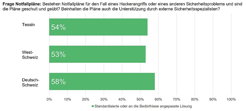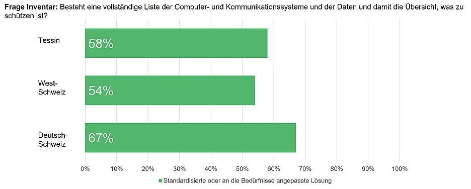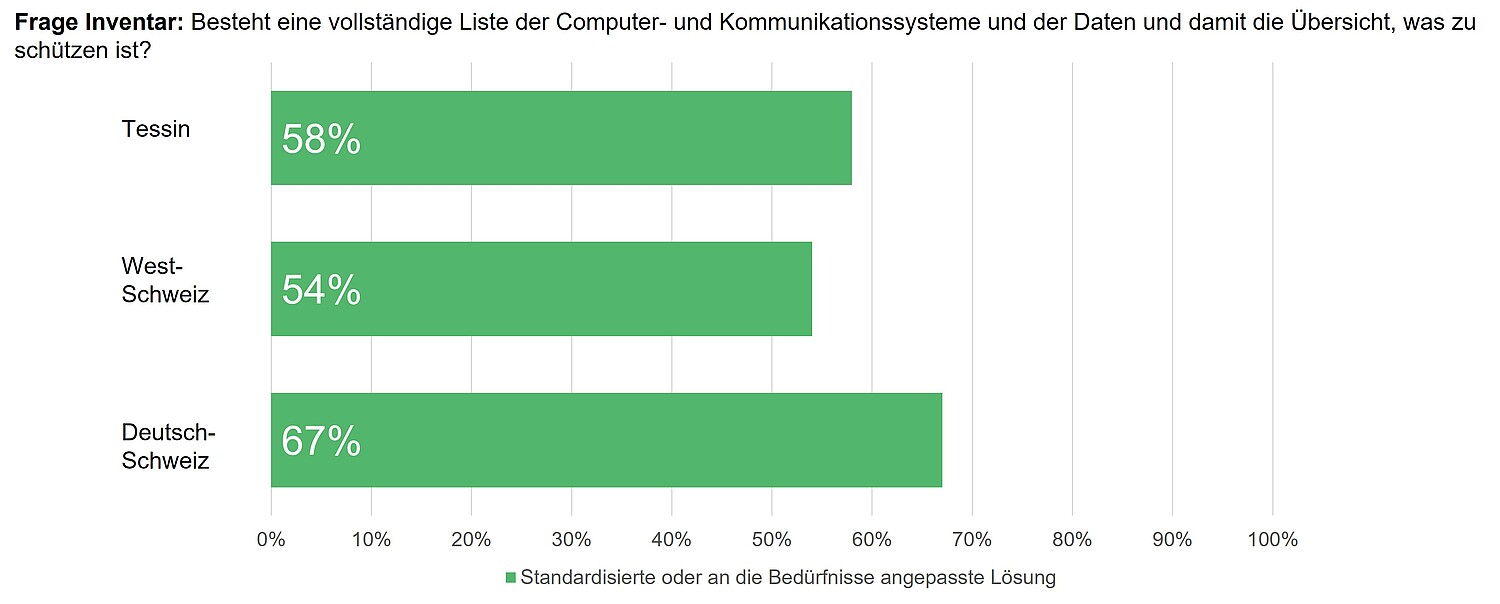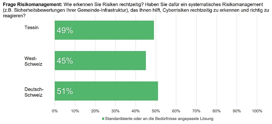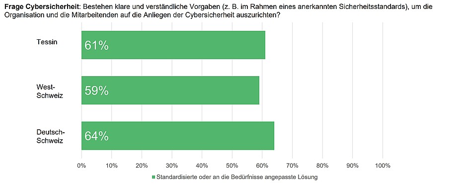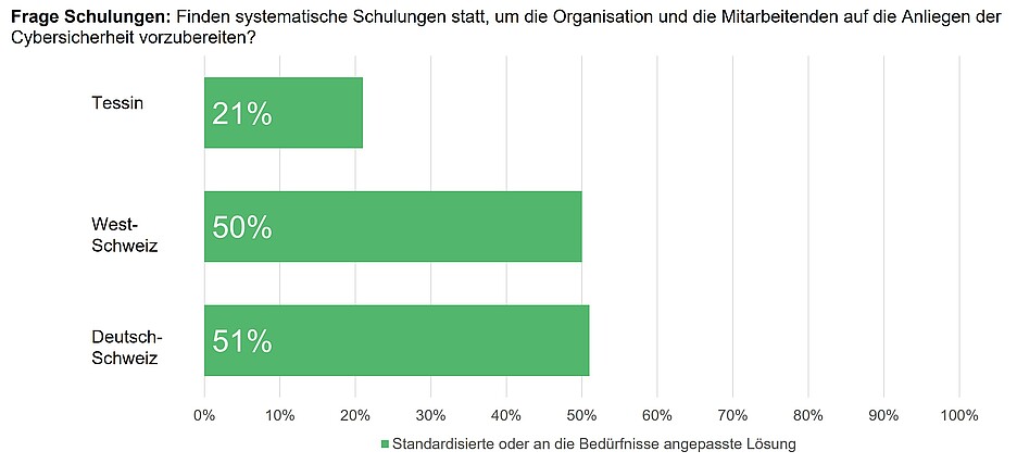 Ein weiterer Schwachpunkt: die Schulungen. In der Deutsch- und Westschweiz verfügen rund 50 Prozent der Gemeinden über ein entsprechendes Schulungsangebot, im Tessin sind es gerade mal 21 Prozent – bei allerdings kleiner Fallzahl. Damit fehlt vielen Mitarbeitenden das nötige Wissen und Verständnis, um sicherheitsbewusst zu handeln (siehe Abb. 5). Neben der Inventarfrage muss insbesondere die Situation in Bezug auf die Schulungen als ungenügend beurteilt werden.