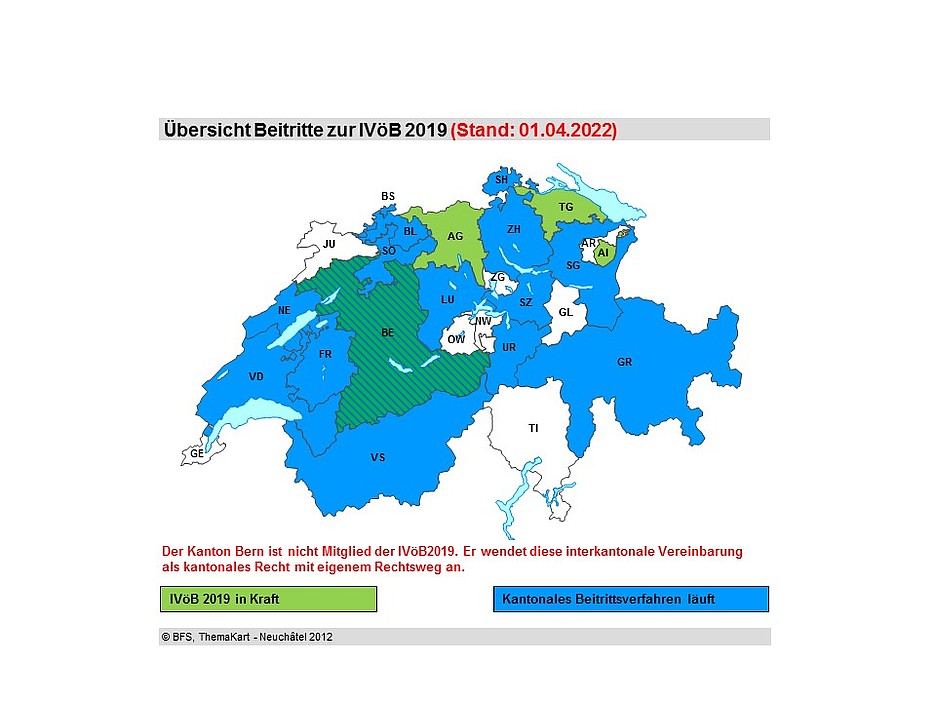 Aufgrund dieser Entwicklungen ist festzustellen, dass der Beitrittsprozess zügig voranschreitet und in vielen Kantonen die IVöB 2019 bis Januar 2023 in Kraft gesetzt sein wird. Auf der Homepage der Bau-, Planungs- und Umweltdirektorenkonferenz (BPUK) wird mit einer Schweizerkarte dargestellt, wo der Beitrittsprozess der einzelnen Kantone steht. Die Karte wird laufend aktuell gehalten.