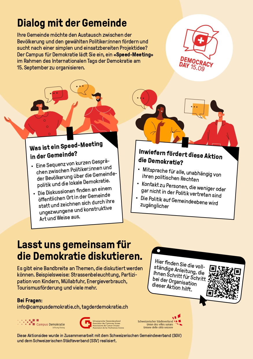 Für die dritte Ausgabe des Tags der Demokratie hat der Campus für Demokratie das Projekt «Dialog mit der Gemeinde» in Zusammenarbeit mit dem Schweizerischen Gemeindeverband sowie dem Schweizerischen Städteverband entwickelt. Das Projekt kommt mit Anleitungen daher und ist somit bereit zur Umsetzung in den Gemeinden und Städten. Die Idee dahinter: Die Bevölkerung und die politischen Behörden in einem informellen Rahmen zusammenbringen; eine Art Speed-Meeting zwischen Bürgerinnen und Bürgern sowie Gewählten, um zusammen über Fragen der Lokalpolitik zu diskutieren.