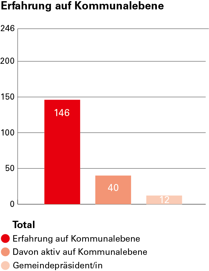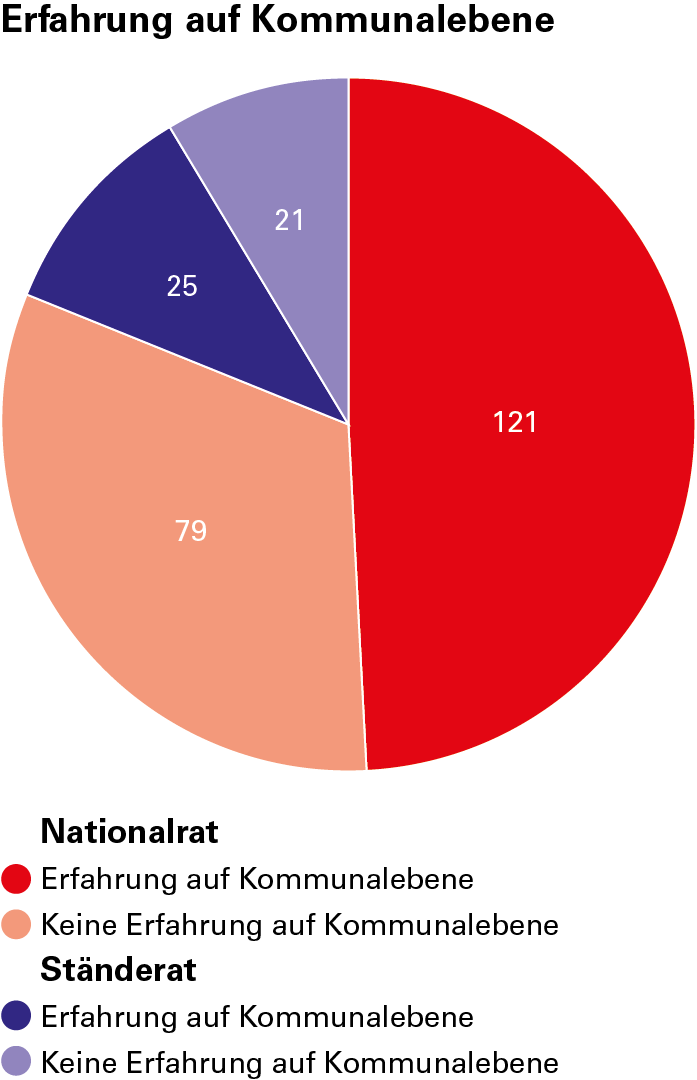 Von den Mitgliedern der beiden Räte, die gleichzeitig aktiv in einer Gemeinde politisieren, sind 75 Prozent Männer und 25 Prozent Frauen. Ein Blick auf die Kantone zeigt, dass jene Kantone, die am meisten Nationalräte stellen, auch am meisten Politisierende mit Gemeindeerfahrung stellen: nämlich die Kantone Zürich (20), Waadt (20) und Bern (16). Die meisten aktiven Gemeindepolitiker kommen ebenfalls aus Zürich und Bern. Der Kanton Solothurn ist der einzige Kanton, dessen Ständeräte auch auf kommunaler Ebene politisieren: Beide sitzen im Gemeinderat der Stadt Solothurn.