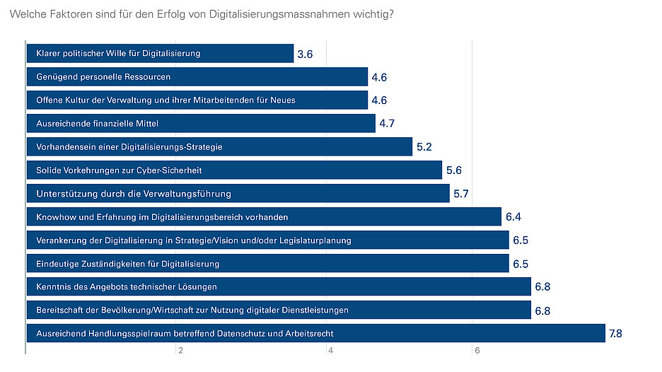 Etwas weniger gut erfüllt sind die Aspekte der Cybersicherheit sowie die Aspekte einer notwendigen offenen Kultur und eines klaren politischen Willens zur Digitalisierung. Das Vorhandensein ausreichender finanzieller und personeller Ressourcen wird deutlich geringer eingeschätzt.