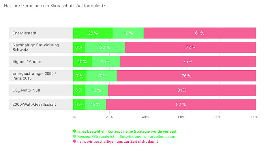 Seit Anfang 2022 gelten in der Schweiz neue Regeln für Grossunternehmen zum besseren Schutz von Mensch und Umwelt. Damit verbunden ist eine Publikationspflicht, in der – verbunden mit dem Ziel der Klimaneutralität bis 2050 – auch der Umgang mit CO2-Emissionen thematisiert wird. Diese aktuelle Entwicklung war für Myni Gmeind und den Gemeindeverband eine Sonderfrage wert. Auf die Frage: Hat Ihre Gemeinde ein Klimaschutzziel formuliert?, antworteten im Durchschnitt rund 75% negativ (siehe Abb. 4). Nur eine von fünf Gemeinden hat zum Beispiel in Bezug auf die CO2-Netto-null-Zielsetzung ein Konzept verabschiedet (6%) oder ein solches zumindest in Planung (13%). Die Gemeinden liegen diesbezüglich also hinter der Privatwirtschaft zurück. Affaire à suivre.