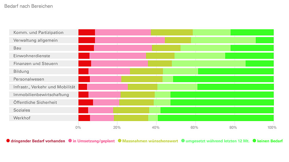Entscheidend sind also Haltung und Einstellung sowie die Ressourcenlage. Nicht aber technische Voraussetzungen oder Kompetenzen. Erfreulich ist in diesem Zusammenhang, dass die Unterstützung durch die Verwaltungsleitung mit 64% Erfüllungsgrad am höchsten bewertet wird.