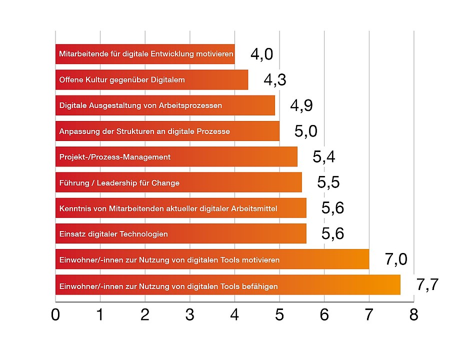 Die tiefe Rangierung der Befähigung der Bevölkerung kann viele Gründe haben. Insgesamt bewegen sich die Akteure möglicherweise in einem gewissen Spannungsfeld: Einerseits beurteilen sie die Motivation und eine offene Kultur als die wichtigsten Erfolgsfaktoren und schätzen ihre eigene Einstellung zur Digitalisierung als positiv ein. Andererseits beurteilen sie den eigenen Digitalisierungsfortschritt skeptisch und halten verstärkte Zusammenarbeit unter den Gemeinden nicht unbedingt für nötig, obwohl Kooperationen und Erfahrungsaustausch in Digitalisierungsprojekten durchaus sinnvoll sind.