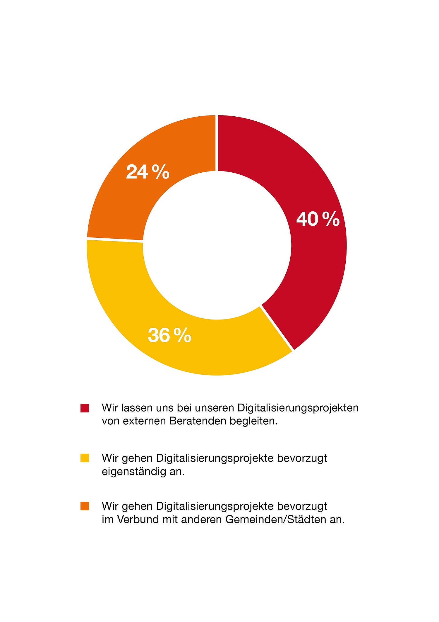 Nur knapp jede vierte Gemeinde plant, Digitalisierungsprojekte gemeinsam mit anderen Gemeinden anzugehen. Die übrigen 75 % bevorzugen den Alleingang, entweder mit externen Dienstleistern (40 %) oder ohne (36 %).