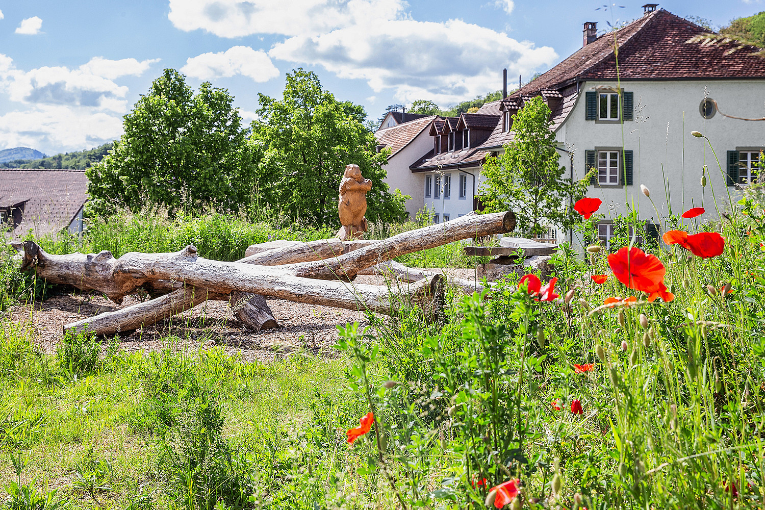 Den Gemeinden kommt dabei eine Pionierrolle zu. Die Grundidee, eine öffentliche Fläche als Vorbild für die Bevölkerung umzugestalten, ist der Kern des Projekts – beim Spaziergang durchs Dorf sehen die Bewohnerinnen und Bewohner die Wirkung einfacher Massnahmen. Dass es dazu nicht viel braucht, zeigt ein Beispiel aus Biberstein. Hier konnte eine Brache inmitten des Dorfes zu einem richtigen Dorfplatz umgestaltet werden: Eine Hecke trennt den Parkplatz ab, die Totholzstämme dienen als Klettermöglichkeit für die Kleinen, eine Sitzbank lädt zum Verweilen und Bestaunen der Blumenwiese ein – ganz nach dem Motto «Lieber ein Vorbild sein, als Verbote zu sprechen», wie Thomas Häuptli, Gemeinderat von Biberstein, sagt. Der Kanton übernimmt die Kosten für einen Informationsanlass für Zuständige innerhalb der Gemeinde und erste Beratungen bei der Aufwertung einer öffentlichen Fläche durch Fachleute. Das Naturama stellt Ideen- und Checklisten für Garten- und Balkonbesitzerinnen und -besitzer bereit sowie Vorlagen für Schilder, die auf der Naturfläche aufgestellt werden können, und für weitere Kommunikationsmassnahmen.