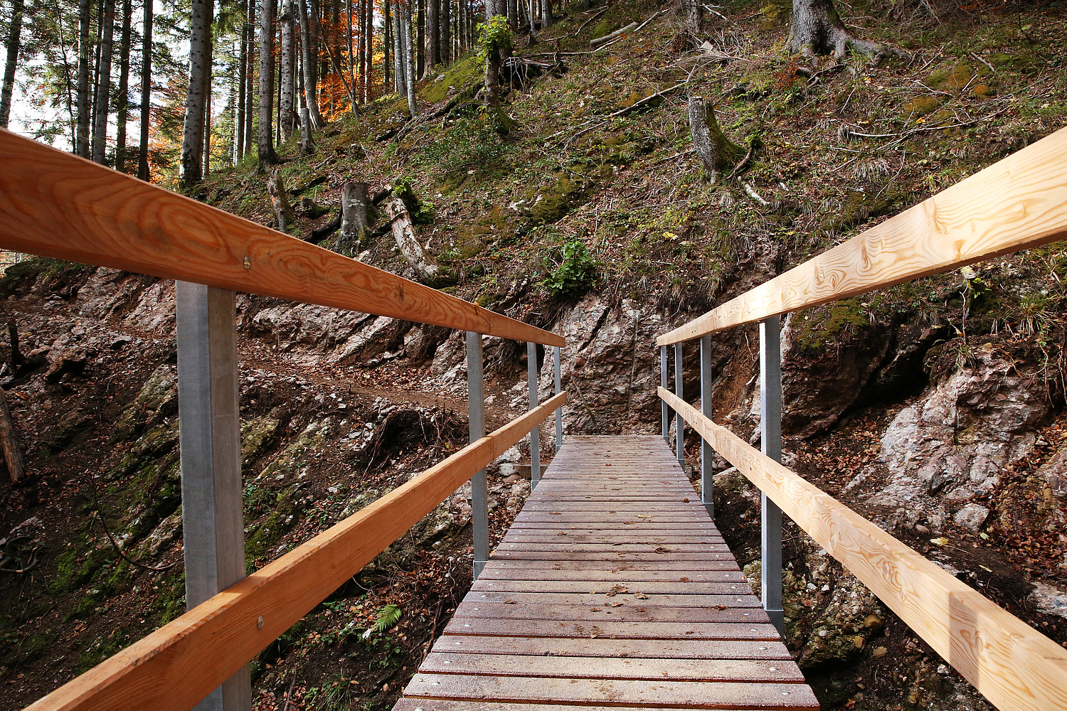 Da der Wegabschnitt in Wald und Wassernähe liegt, ist er schattig und feucht. Gegenüber einem reinen Holzbau ist die neu erstellte Metall-Holz-Konstruktion weniger witterungsanfällig. Die Brücke überspannt den Ziegelbach mit einer Länge von zehn Metern. Der neue Zugang führt entlang des Felsens und ist mit einem Handlauf gesichert.