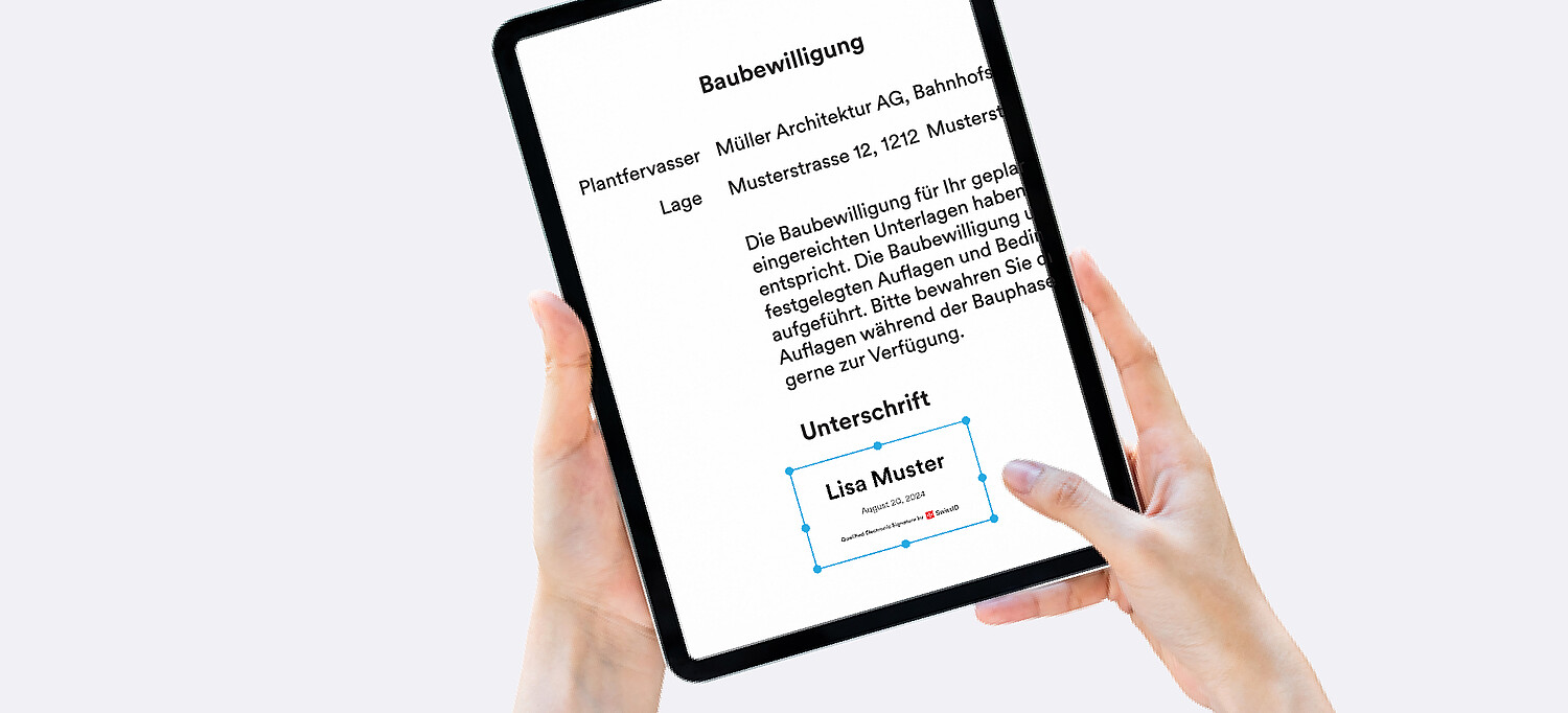 Baubewilligungen werden in gewissen Gemeinden bereits elektronisch eingereicht, der Baurechtsentscheid aber meist noch auf dem Postweg verschickt. Doch mittels der qualifizierten elektronischen Signatur (QES) lässt sich auch dies digitalisieren. Diese ist nämlich der handschriftlichen Unterschrift gleichgestellt (Art. 14, Abs. 2bis OR).