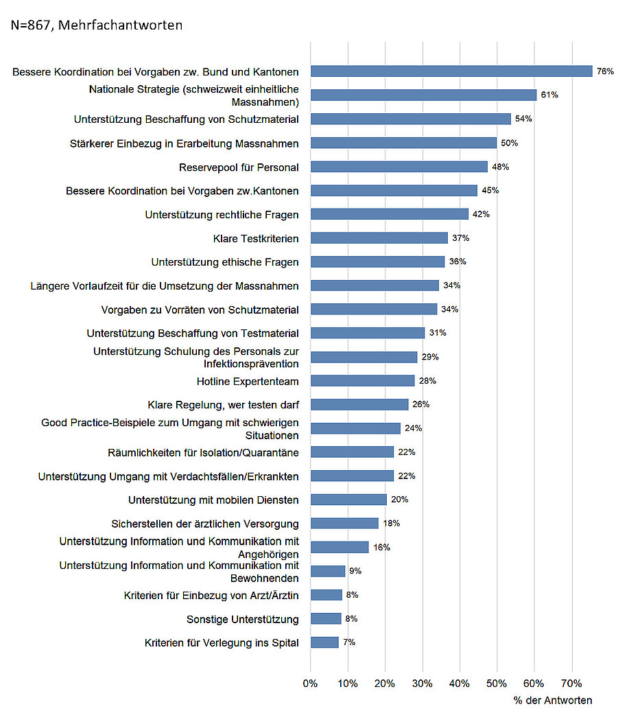 Dabei gilt die Feststellung für den Bund, die Kantone, aber auch die Institutionen und Pflegeeinrichtungen. Wer glaubt, sich in umfassenden Krisen, wie es die aktuelle Pandemie ist, notfallmässig mit benötigtem Material oder erforderlicher Ausrüstung versorgen zu können, der irrt. Entsprechend ist der von den befragten Heimleitungen hier geäusserte Wunsch explizit zu unterstützen. Unabdingbare Voraussetzung für eine erfolgreiche Bewältigung von Bedrohungslagen ist die ausreichende Bereitschaft. Vor dem Ereignis. Umfassend.