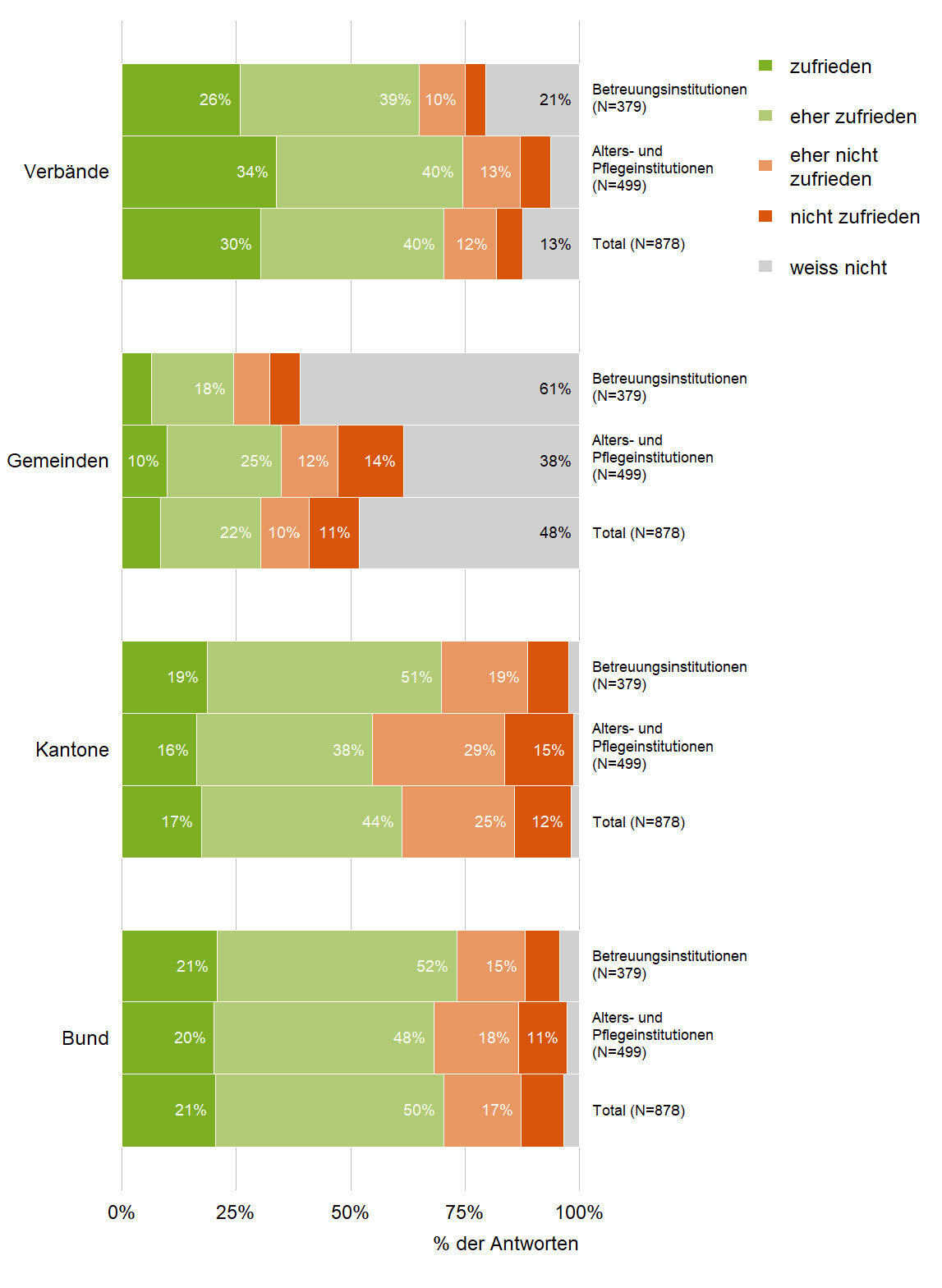 Die Umfrage von INFRAS ist zu unterteilen in Feststellungen und folgerichtig in Wünsche an die Behörden, die von den Heimleitungen geäussert wurden. Diese zeigt bezüglich Zufriedenheit, ausgesprochenen Empfehlungen und angeordneten Massnahmen der nationalen, kantonalen und kommunalen Behörden sowie der Verbände im Gesundheitsbereich deutlich, dass die Rolle der Gemeinden nur sehr untergeordnet oder gar überhaupt nicht wahrgenommen wurde. Bund, Kantone und vor allem die Verbände standen im Fokus der Öffentlichkeit. 30% der befragten Heimleitenden waren zufrieden mit den Gemeinden, 22% eher nicht oder gar nicht, und 48% wussten nicht, ob sie zufrieden sein sollten oder nicht. Das ist symptomatisch, und es zeigt, dass die Zuständigkeiten offensichtlich zu wenig klar sind. Vor allem wird die dominante Rolle der Verbände im Gesundheitsbereich deutlich; teilweise wurden durch sie direkt Handlungsanweisungen in den Heimen erteilt. Dies, obwohl sie Interessenvertretungen und Fachorganisationen sind, die weder führungsmässig noch finanziell in der direkten Verantwortung stehen.