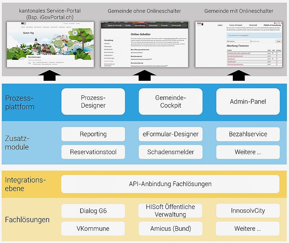 Ein grundlegender Schritt in Richtung digitale Verwaltung war das mit dem Kanton zusammen entwickelte Smart Service Portal, auf dem die Einwohnenden neu zentral kommunale und kantonale Dienstleistungen beziehen können. Das Smart Service Portal ist aus Kundensicht folglich das wichtigste Element, aber aus Sicht des Konzepts «Digitale-Gemeinde.com» dient dieses Onlineportal lediglich der Anzeige der kommunalen Dienstleistungen. Das Herzstück ist nämlich eine Prozessplattform, mit der die bestellten Services nach einer klar vorgegebenen Logik abgearbeitet werden und die als Datendrehscheibe zwischen Portal, Servicecockpit und/oder Gemeinde-Fachlösung fungiert.