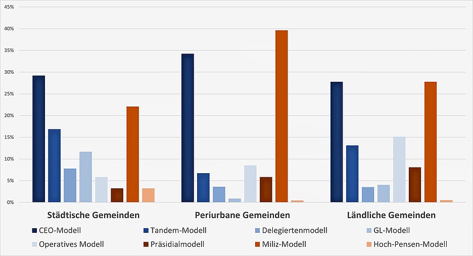 Die Abbildung 1 zeigt, dass unter den bisher analysierten 590 Gemeinden das CEO-Modell sowie das Milizmodell am häufigsten vertreten sind. Das Milizmodell zeigt eine geringfügig niedrigere Anwendung in städtischen Gemeinden. Das Delegierten- und das Geschäftsleitungsmodell sind in Städten deutlich verbreiteter, während das operative Modell vor allem in ländlichen Gegenden häufiger anzutreffen ist.