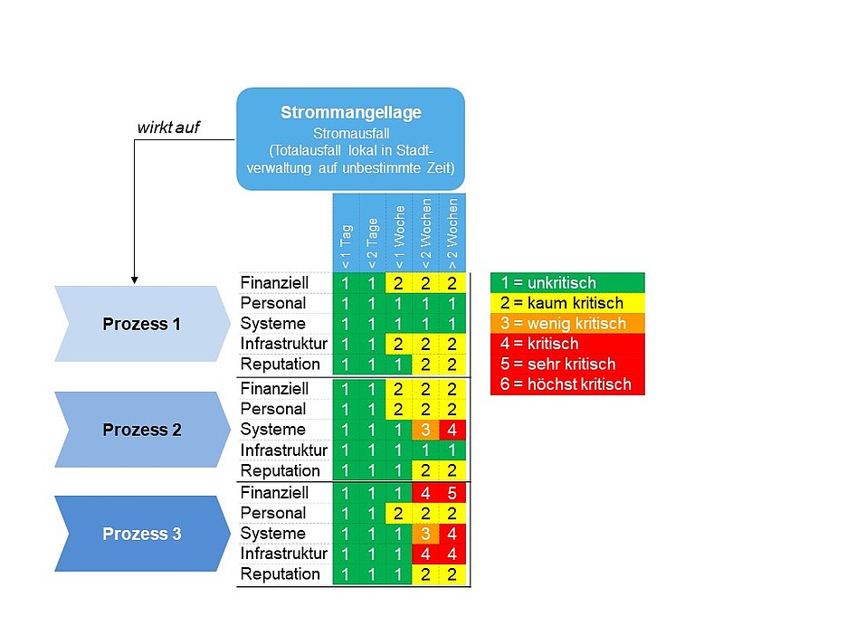 Bei der Stadt Baden betrachteten die Prozessverantwortlichen den Einfluss einer Strommangellage auf den ausgewählten Pilotprozess. Die Auswirkungen wurden in Bezug auf die Parameter «Finanzen», «Personal», «Systeme», «Infrastruktur» und «Reputation» auf einer sechsstufigen Skala bewertet.