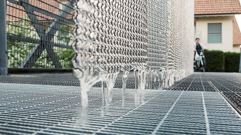 Laut David Fuchs, dem Hersteller des Objekts, wurde der Wasserschleier wie ein Instrument gestimmt. Das Alphamesh, eine spezielle Art von Edelstahlgeflecht, sowie die Auslassdüsen am oberen Ende des Objekts und die Wassermenge spielen dabei eine Rolle. Zur überraschenden Begegnung der Passanten mit dem Wasser kann beitragen, dass die elektronische Steuerung automatisch den Wasserfluss ändert oder stoppt. Alternativ können sowohl Bosshard wie auch Fuchs und sein Team vom Metallatelier aus der Ferne derartige Änderungen via Internetverbindung spontan auslösen, vielleicht ein Spiel mit den Passanten beginnen – ohne dass die Akteure in der Ferne und die Betrachter vor Ort sich sehen müssen.
