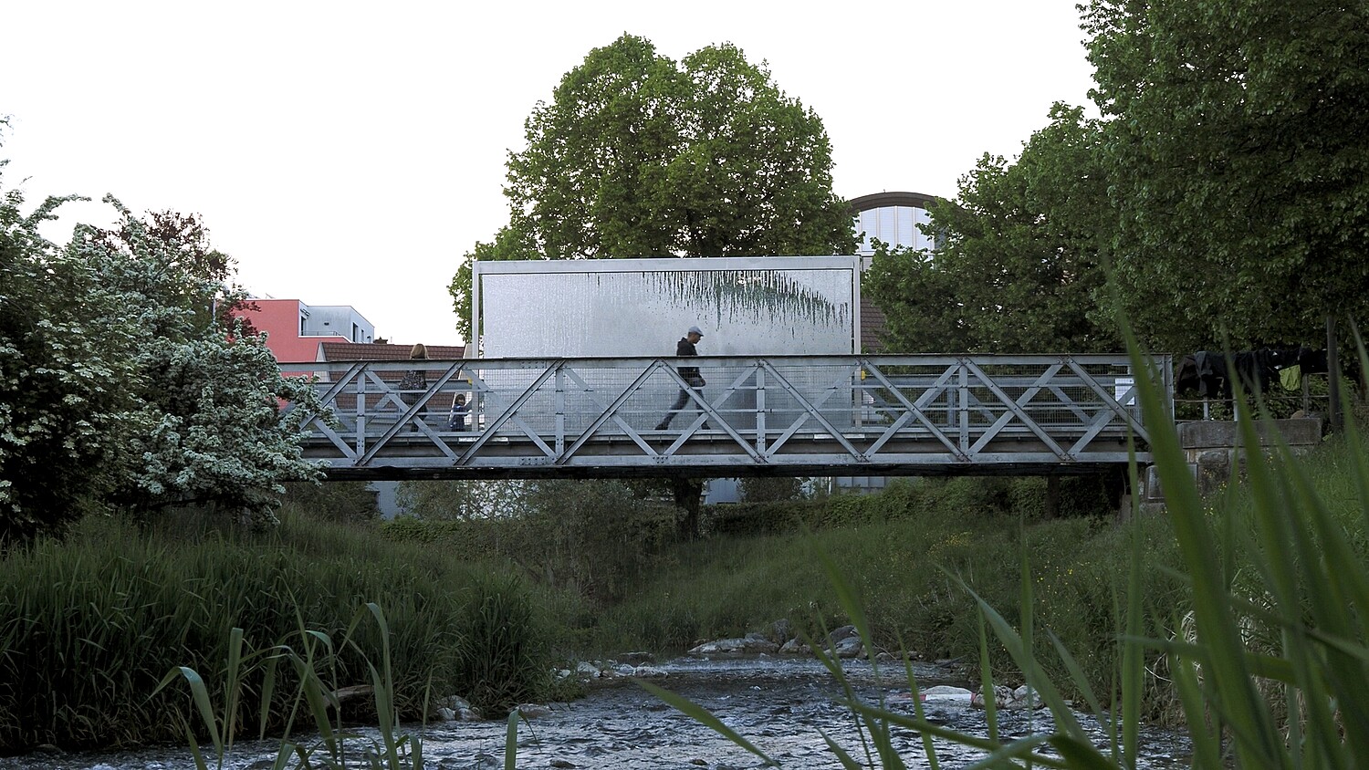 Womit identifizieren sich aktuell die Bewohner im Limmattal? Wo alles fliesst, in Bewegung ist und rauscht – der Strassen- und Schienenverkehr, der Luftverkehr von und nach Zürich und selbst das Wasser der Limmat und der Reppisch. Jedenfalls noch dort hörbar, wo es nicht kanalisiert wurde. Zürich hat einen seiner Identifikationsorte beim Hafen Enge auf dem Zürichsee, das Aquaretum. Auch Genf hat seine Fontäne, bringt das Wasser sogar noch höher hinaus. Vielleicht gelingt Identifikation gerade so: das Wasser nach oben pumpen, wie derzeit ebenfalls aus der Reppisch auf die Vorstadtbrücke in Dietikon. Hier hat Bosshard in Zusammenarbeit mit dem Metallatelier ein temporäres Objekt, einen vertikalen Wasserschleier, entworfen, der ganz bewusst mitten auf einer Brücke steht, um eine überraschende Begegnung mit diesem Ort anzuregen.