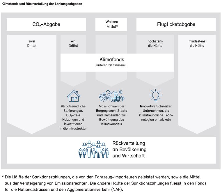 Der Klimafonds ist das Finanzierungsinstrument, das in der Totalrevision des CO2-Gesetzes vorgesehen ist. Finanziert werden soll er durch die CO2-Abgabe, eine Lenkungsabgabe auf Flugtickets, die Erträge aus den Versteigerungen von Emissionsrechten sowie aus Sanktionseinnahmen.