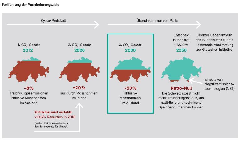 Die Revision des CO2-Gesetzes ist ein erster Schritt auf dem Weg zur Erfüllung des Netto Null Ziels bis 2050. Mit dem revidierten CO2-Gesetz sollen die CO2-Emissionen der Schweiz bis 2030 im Vergleich zu 1990 halbiert werden. Damit kann die Schweiz ihre Verpflichtungen aus dem Pariser Klimaabkommen erfüllen. Nach langwierigen Beratungen, die im Jahr 2018 begonnen haben, hat die Bundesversammlung den Gesetzesentwurf schliesslich im Herbst 2020 verabschiedet. Die darin enthaltenen Massnahmen gehen den Klimaaktivisten zu wenig weit, für die SVP und bestimmte Wirtschaftszweige wiederum sind sie zu interventionistisch. So wurden zwei parallele Referenden gegen dieses Gesetz ergriffen - vielleicht ist es darum ja ein perfektes Beispiel eines gutschweizerischen Kompromisses. Das Gesetz kommt am 13. Juni 2021 zur Abstimmung.