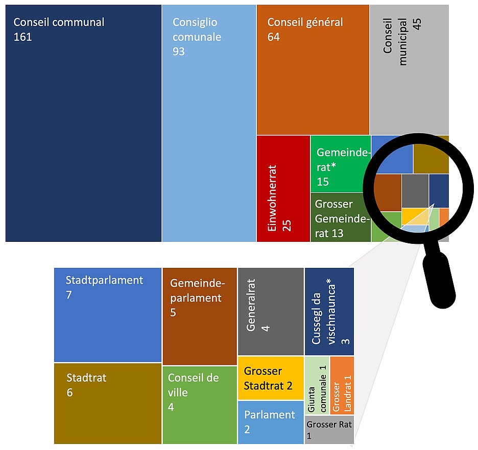 So stellt sich denn nun die Frage, wie sich die 451 kommunalen Parlamente (Stand: 6. April 2025) der Schweiz benannt haben. Welche Bezeichnungen gibt es, welche sind exotisch, welche sehr verbreitet? Abbildung und Tabelle zeigen, dass die verwendeten Begriffe höchst unterschiedlich sind.