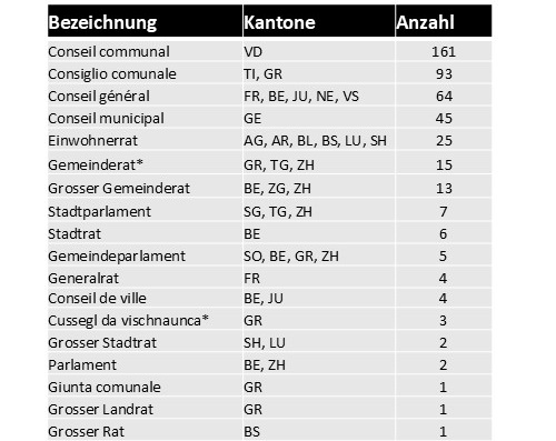 Wie steht es nun um die vorgeschlagene Bezeichnung «Gemeindeparlament»? Das mag eine Überraschung sein: Es gibt lediglich fünf kommunale Legislativen in der Deutschschweiz (in den Kantonen Bern, Graubünden, Solothurn, Zürich), die diese Bezeichnung tragen. Ein Grund liegt wohl darin, dass gerade für Städte mit der Exekutivbezeichnung Stadtrat die Bezeichnung Gemeindeparlament seltsam anmutet.