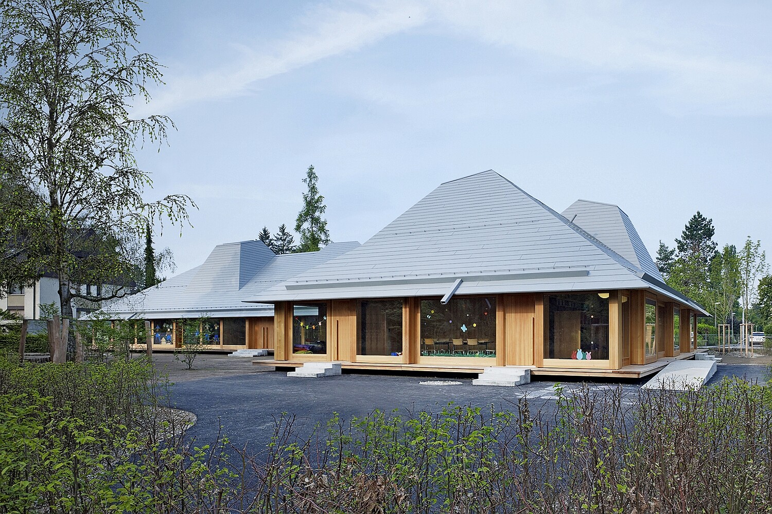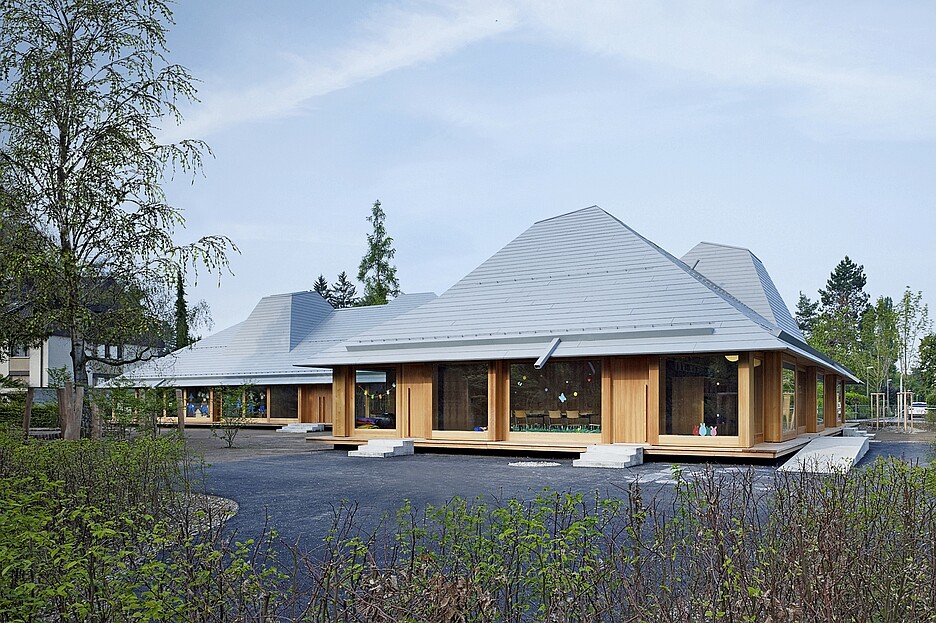 Der neue Doppelkindergarten mit Tagesstruktur bezieht sich räumlich auf das kleinteilige Wohnquartier, das ihn umgibt. Drei Kernzonen gliedern den Grundriss und nehmen die notwendigen Nebenräume auf. Sie bilden zusammen mit den Dachflächen ein effizientes Tragwerk aus Holz. Die Räume öffnen sich mit grosszügigen Fensterflächen nach aussen zur überdachten Vorzone, die partiell witterungsgeschützte Spielflächen bietet und zum Garten überleitet. Die Dachräume zwischen den Haupträumen bieten den Kindern zusätzliche Spiel- und Rückzugsbereiche.