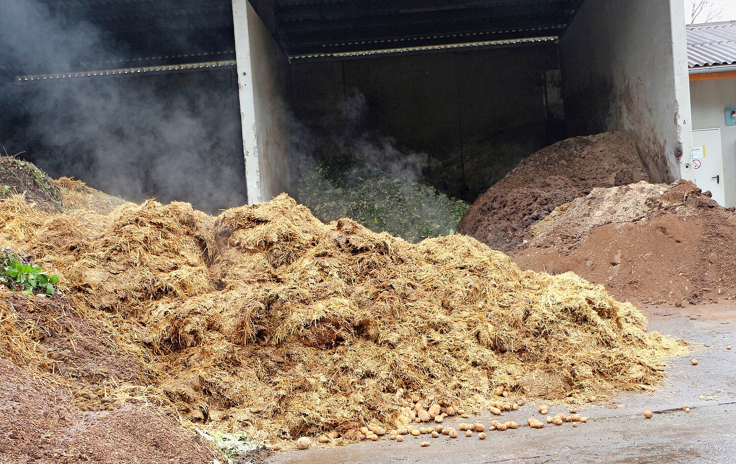Mist ist farbenfroh – grün für Rüstabfälle, braun für Hühnermist, hellbraun für Rindermist. Auf dem Deponieplatz der Biogasanlage auf dem Hof Unterbuck der Familie Christian und Andrea Müller in Thayngen (SH) türmen sich Berge, die anschliessend durch einen Schredder verkleinert in die sechs Meter tiefen Gärbehälter gelangen. Ein Traktorführer eines Nachbarbetriebs ist gerade dabei, einen Anhänger voller Flüssigjauche zu entleeren. Das Gitter der Füllklappe ermöglicht einen Blick in die blubbernde, homogene schwarzbraune Masse.
