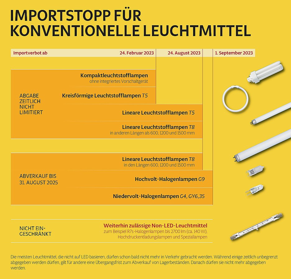 Dank LED sinkt der Stromverbrauch im Vergleich zur herkömmlichen Leuchtstofflampe für dieselbe Leistung auf bis die Hälfte. Weil seit einigen Jahren praktisch alle Anwendungen auch als LED verfügbar sind, erobert die Technologie immer grössere Marktanteile. Ein erfreulicher Nebeneffekt: Die Preise für die modernen Leuchtmittel sinken weiter. Nun beschleunigen Gesetze den Wechsel zu mehr Effizienz bei der Beleuchtung. In den nächsten zwei Jahren dürfen die allermeisten bisherigen Typen von Leuchtmitteln nicht mehr importiert, später ein Teil davon auch nicht mehr verkauft werden (vgl. Grafik). Grund dafür sind einerseits strengere Anforderungen an die Energieeffizienz, andererseits das europaweite Verbot von Quecksilber in Verbrauchsgütern.