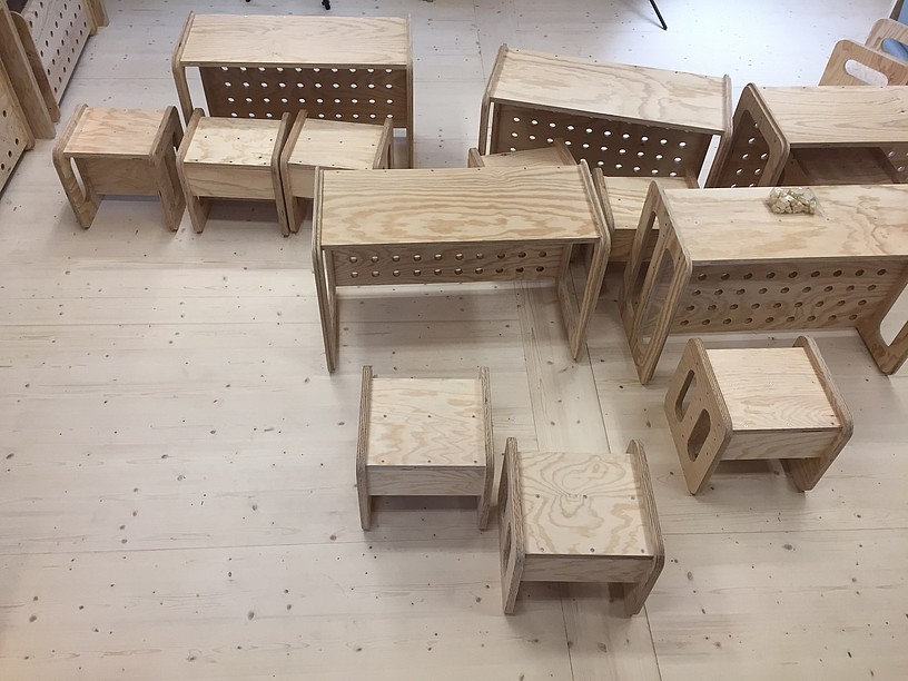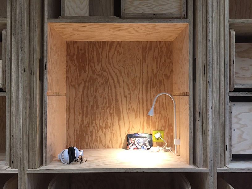 Hauptbestandteile der Lernwelt sind die hölzernen Innenausbauten mit Stauraum auf allen Raumseiten. Sie bieten Platz für unterschiedliches Mobiliar, das je nach Bedarf zusammengestellt werden kann – ein paar Sitzbänke und ein Brett lassen sich zur Rampe umfunktionieren, oder auch zum Pult. Tische, Bänke, Hocker, Sitzkissen, Toolboxen sind flexibel, fest eingebaute Elemente wie Sitznischen geben den Kindern die Möglichkeit zum Rückzug. Die natürliche Oberfläche des Holzes, vielfältige textile Elemente sowie dimmbares Licht geben dem Raum Wärme und lassen unterschiedliche Atmosphären generieren. Da Anzahl und Alter der Kinder in Asyl- und Durchgangszentren häufig wechseln, ist die Anpassungsfähigkeit des Raumes zentral.