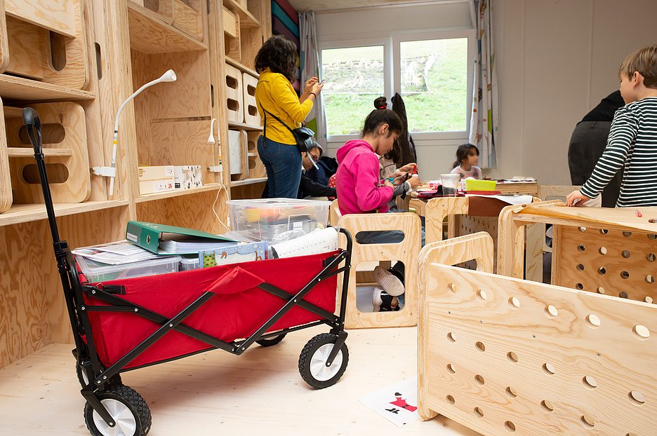 «Von konzentrierten Einzelarbeiten über Gruppenunterricht bis hin zu ruhigen Beschäftigungen oder aktiven Bewegungsspielen ist alles möglich», sagt Projektleiterin Selina Lutz. In den Wänden lässt sich versorgen, was gerade nicht gebraucht wird. Untergebracht sind die Lernwelten in einem Container. Selina Lutz erklärt, weshalb: «Container gibt es überall, sie sind verhältnismässig günstig, weltweit leicht zu beschaffen und lassen sich im Vollausbau transportieren. Dies ist wichtig, denn die Lernwelten sind für die Anwendung in Europa und – mit Anpassungen – auf der ganzen Welt konzipiert.»