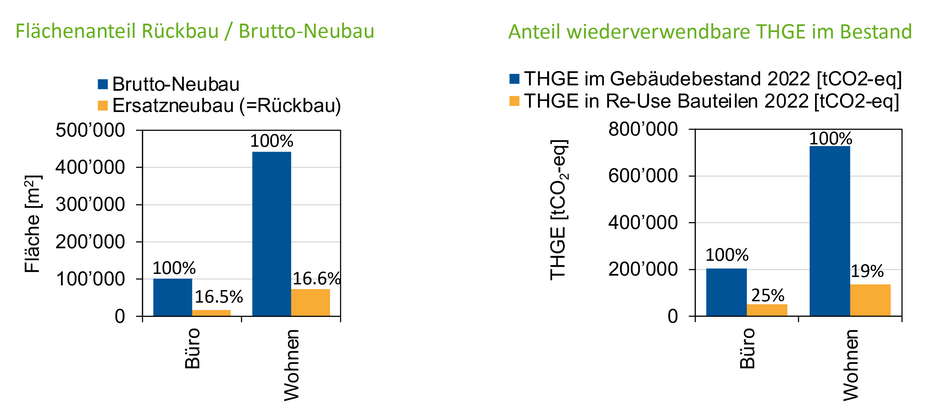 Das grösste Potenzial zur Einsparung von Umweltbelastung liegt bei der Wiederverwendung von konstruktiven Bauteilen (Decken, Wände, Dächern) aus Stahlbeton, Kalksand- und Backstein sowie von Metallbauteilen aus dem Innenausbau (Abhangdecken, Stützen, Doppelböden). Nicht alle Gebäudeteile lassen sich indes wiederverwenden; das schmälert den Anteil der grauen Treibhausgasemissionen, der sich durch Re-Use einsparen lässt. Der Anteil liegt gemäss Studie bei Bürogebäuden bei 25 Prozent und bei Wohngebäuden bei 19 Prozent.
