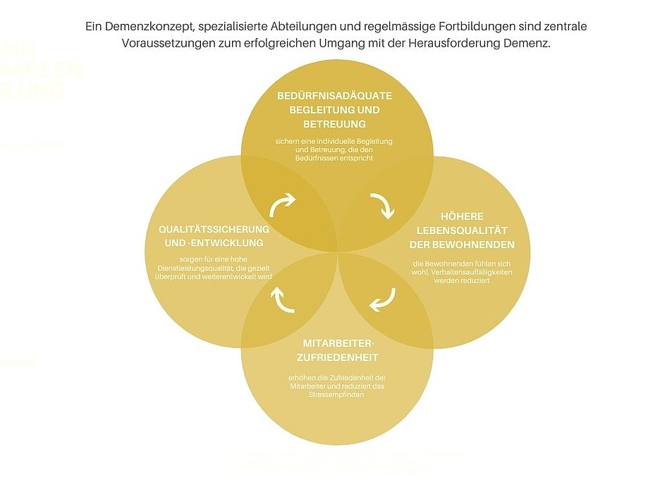 Infrastruktur, Begleitung und Betreuung, aber auch der Umgang mit den Angehörigen sind, in Orientierung an das Dementia-Care-Label, sorgfältig durchdacht. So werden zum Beispiel die Räumlichkeiten stets den Bedürfnissen und dem Bedarf der Bewohnenden angepasst. Betritt man das Haus, so erinnert nichts an ein Heim. Stattdessen erzählen die Möbel Geschichten aus dem Leben der Bewohnenden. Aber nicht nur die Einrichtung, auch das Verhalten der Mitarbeitenden sowie die Rituale sind darauf ausgerichtet, Geborgenheit, Sicherheit und Normalität zu vermitteln. Dabei wird unter Normalität nicht das verstanden, was die gesellschaftliche Norm ist, sondern normal ist, was für den betroffenen Menschen vor dem Hintergrund seiner individuellen Lebensgeschichte und seiner Wahrnehmung, seiner Gedanken und Gefühle normal erscheint. Dementsprechend wird die Begleitung und Betreuung sehr individuell gestaltet und grossen Wert auf die Selbstbestimmung der Bewohnenden gelegt.