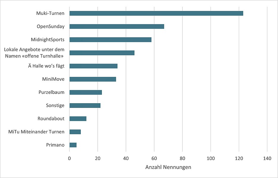40 Prozent der Befragten kennen Angebote unter dem Begriff «offene Turnhalle» für Kinder im Vorschulalter. Es wird damit vor allem das Mutter-/Vater-/Eltern-/Grosseltern-Kinder-Turnen (N=123) in Verbindung gebracht, ein strukturiertes, angeleitetes Gruppenangebot. Des Weiteren sind die Angebote OpenSunday (N=67), MidnightSports (N=58), lokale Angebote (N=46), Ä Halle wo’s fägt (N=34) sowie MiniMove (N=33) bekannt. Die Angebote OpenSunday und MidnightSports der Stiftung IdéeSport richten sich an ältere Kinder und Jugendliche.