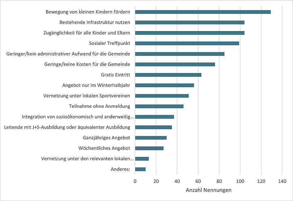 Jene Elemente, die den Gemeinden im Zusammenhang mit diesen Bewegungsangeboten am wichtigsten sind, sind auch zentrale Charakteristika der bestehenden Angebote wie «Ä Halle wo’s fägt» und «MiniMove». Dies sind: die Bewegung von kleinen Kindern fördern, die bestehende Infrastruktur nutzen, die Zugänglichkeit für alle Kinder und Eltern, die Funktion als sozialer Treffpunkt und ein geringer oder gar kein administrativer Aufwand für die Gemeinde.