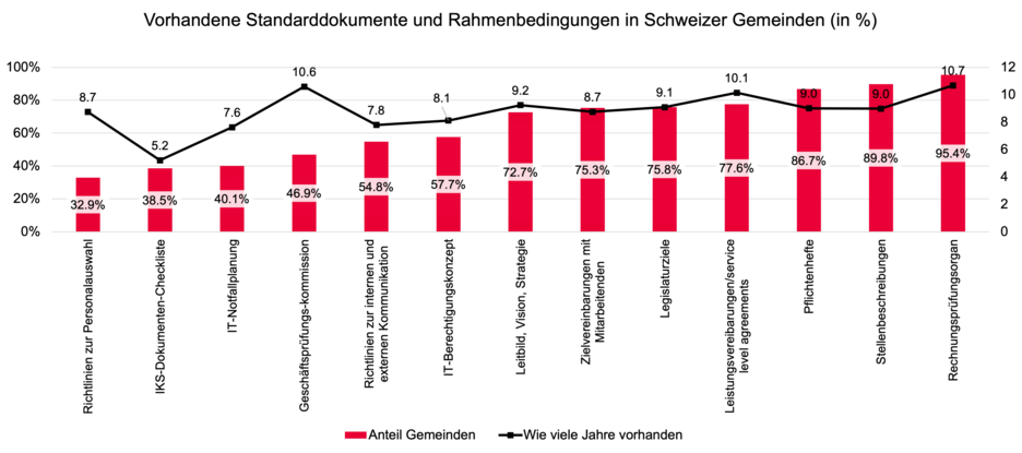 Ein IKS umfasst eine Vielzahl möglicher Prozesse und Dokumente, die eine strukturierte und systematische Steuerung ermöglichen. Die Studie zeigt allerdings, dass die Nutzung in Gemeinden noch stark variiert. Abbildung 3 zeigt die Nutzung von IKS-Instrumenten in Schweizer Gemeinden. Einige Instrumente wie Legislaturziele, Pflichtenhefte oder Zielvereinbarungen mit Mitarbeitenden werden in der überwiegenden Mehrheit der Gemeinden bereits genutzt. Andere Instrumente wie IT-Sicherheitskonzepte und Richtlinien zur Personalauswahl fehlen hingegen in vielen Gemeinden.
