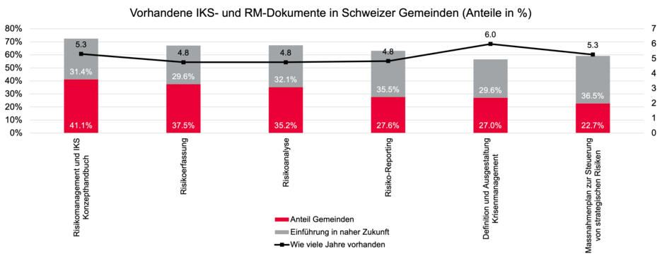 Während wichtige IKS-Instrumente in den allermeisten Gemeinden vorhanden sind und genutzt werden, existiert ein strukturiertes und standardisiertes RM nur in rund 30 Prozent der Gemeinden. Abbildung 4 zeigt die Nutzung von RM-Instrumenten in Schweizer Gemeinden. Insbesondere ein systematischer Massnahmenplan zur Steuerung strategischer Risiken fehlt in mehr als drei Vierteln aller Schweizer Gemeinden. Zwar planen weitere 30 Prozent der Gemeinden, die jeweils fehlenden Dokumente und Aktivitäten in naher Zukunft einzuführen. Ein fehlendes Risikomanagement und vor allem ein fehlender Massnahmenplan zur Steuerung dieser Risiken kann jedoch bedeuten, dass im Zweifelsfall Risiken zu spät erkannt und Gegenmassnahmen zu spät oder unsystematisch ergriffen werden.