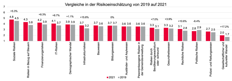 Konsistent mit dem soeben vorgestellten Ergebnis, sind die Risikoeinschätzungen von Schweizer Gemeinden in den zwei Jahren der Pandemie durchgehend gestiegen. Abbildung 2 fasst die wichtigsten Risiken für Schweizer Gemeinden 2021 sowie deren Veränderung gegenüber 2019 zusammen. Sie zeigt, dass auf einem absoluten Niveau soziale Risiken (z.B. steigende Kosten im Sozialbereich) wie bereits vor der Pandemie dabei am relevantesten bleiben. Prozentual gewinnen jedoch vor allem Risiken in Bezug auf Steuern (z.B. relevante Steuerausfälle), Finanzierungsrisiken (steigende Verschuldung) und Infrastrukturrisiken (Versorgungssicherheit) durch die Coronapandemie an Bedeutung.