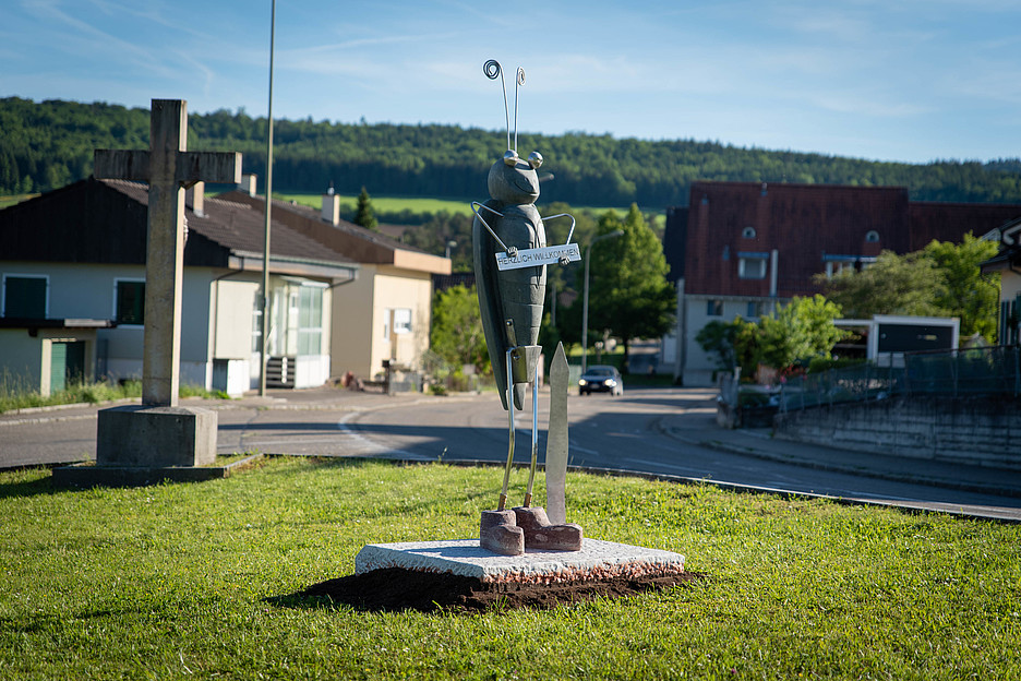 Gelangt man von Chall her zum Dorfeingang, treibt der «Mattegumper» in Röschenz (BL) sein Unwesen. Zumindest sorgt er für eine gewisse Aufmerksamkeit bei all jenen, die an ihm vorbeifahren oder -gehen. Der «Mattegumper» ist ein Grashüpfer und gleichzeitig der Übername für die Röschenzer. Laut Gemeindepräsident Holger Wahl wurden sie so genannt, weil die Bauern des Dorfes früher in den umliegenden Gemeinden Land dazupachteten und so wie eben die «Mattegumper» sehr beweglich sein mussten, um die weit auseinander liegenden Felder zu bewirtschaften. Davon hat sich der einheimische Künstler Daniel Weber inspirieren lassen, als er von der Gemeinde den Auftrag erhielt, eine Skulptur für den Dorfeingang zu kreieren. Entstanden ist eine Grashüpferskulptur aus Stein und Stahl, die zum Schmunzeln einlädt.