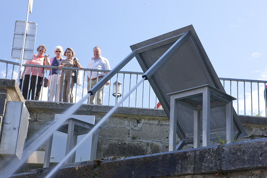 Das zweite Kunstwerk von Roman Signer bewegt sich ebenfalls und bringt zudem noch das Wasser mit ins Spiel. Genauer gesagt geht es hier um einen Metalltisch direkt am Ufer der Sitter, aus dessen vorderen Beinen alle drei bis vier Minuten ein Wasserstrahl herausschiesst. Durch den hohen Druck des Wassers hebt sich der Tisch in einem Winkel von 45 Grad, und das Wasser spritzt in einem schönen Bogen in die Sitter. Dieses Spektakel kann vom Strassenrand aus mitverfolgt werden. «Beide Kunstwerke sind zu Magneten geworden und sprechen insbesondere ein kunstaffines Publikum an», beobachtet Guido Buob. Dass sich das Appenzellerland mit zeitgenössischer Kunst präsentiere, sei jedoch eher untypisch und als Nische zu betrachten. Denn normalerweise stehen Tradition und Brauchtum im Zentrum der Appenzeller Kultur.