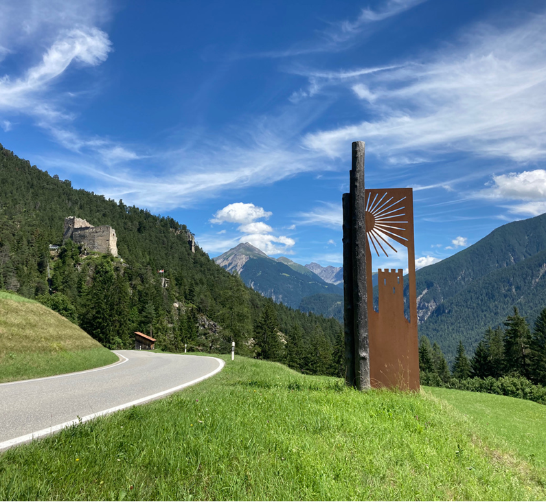 In Zusammenarbeit mit Roman Platz entstand die Idee einer Skulptur aus Stahl und Holz. Die Skulptur setzt sich aus drei typischen Elementen zusammen, die das Dorf widerspiegeln: der restaurierten Burgruine Belfort, der Sonne – die Gemeinde erhielt 1991 als erste der Schweiz den Schweizer Solarpreis – und schliesslich den Baumstämmen, die das Dorf vor Bergrutschen schützen. Bevor Roman Platz mit der Umsetzung starten konnte, musste die Bevölkerung dem Kredit an der Gemeindeversammlung zustimmen. Ausserdem benötigte das Vorhaben laut Rico Liesch die Bewilligung vom Amt für Raumentwicklung und vom kantonalen Tiefbauamt, da die Skulpturen ausserhalb der Bauzone und an der Kantonsstrasse liegen. «Es braucht einen entsprechenden Abstand vom Strassenrand, damit genügend Platz für die Schneeräumungsfahrzeuge und LKWs vorhanden ist», erklärt Rico Liesch.
