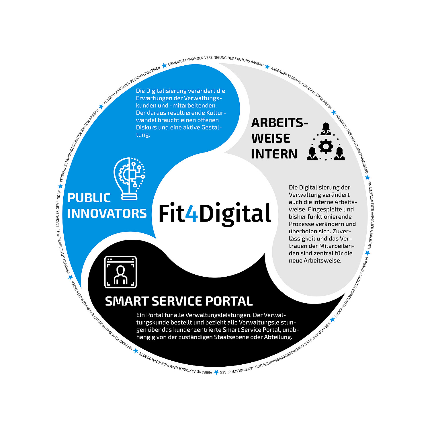 Mit dem digitalen Innovationsprogramm «Fit4Digital» gestaltendie Aargauer Gemeinden zusammen mit dem Kanton die Entwicklung von E-Government aktiv mit. Dazu gehören ein Smart Service Portal für die Bevölkerung und die Verwaltung sowie Public Innovators.