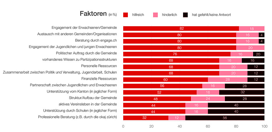 Die Studie hat hilfreiche und hinderliche Faktoren identifiziert für den Aufbau von kommunalen Partizipationsstrukturen und -instrumenten für junge Menschen. Insbesondere das Engagement der involvierten Personen kann den erfolgreichen Aufbau von Partizipationsstrukturen stark beeinflussen. Als besonders hilfreich wurden die Beratung durch engage.ch und der Austausch mit anderen Gemeinden oder Organisationen genannt. Der Mangel an finanziellen und personellen Ressourcen, der Aufbau der Gemeinde sowie eine fehlende oder schwierige Zusammenarbeit mit Politik, Verwaltung, Jugendarbeit und Schule erschweren den Aufbau.