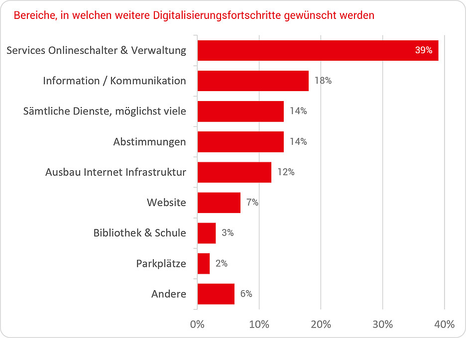 Weitere Digitalisierungsschritte wünschen sich die Digitalisierungsbefürworter vor allem im Bereich des Online-Schalters (39%). Der Gang auf das Amt sollte sich nach Möglichkeit erübrigen und der Bezug von Dienstleistungen möglichst von Öffnungszeiten entkoppelt sein. Denn im Home-Office wurde gelernt, dass vieles ohne persönliche oder physische Kontakte möglich ist.