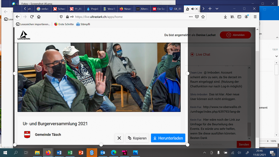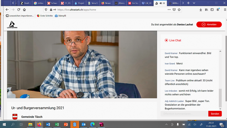 Beim Traktandum Verschiedenes ermuntert der Gemeindepräsident die Online-Zuschauer, ihre Fragen im Chat zu stellen, damit das System getestet werden kann. Doch obwohl rund 50 Personen online dabei sind, kommen ebenso wenig Fragen aus dem Web wie aus dem Saal. Dafür gibt es Kommentare im Chat, viel Lob für die neue Art der politischen Teilnahme. Das Live Stream-Projekt könnte Zukunft haben, schreibt jemand, es wäre eine gute Lösung, um das nachlassende politische Interesse zu fördern. Natürlich wäre es optimal, wenn so auch abgestimmt werden könnte, heisst es im Chat. Denn so könnten auch Eltern von kleinen Kindern, Kranke oder Menschen mit eingeschränkter Mobilität teilnehmen. Der Live Stream biete neue Möglichkeiten, auch wenn online noch nicht abgestimmt werden kann: Auch Zweitwohnungsbesitzer oder Weggezogene könnten sich so über das Geschehen in Täsch informieren. «Super Initiative, Gemeinde Täsch, Gratulation!»