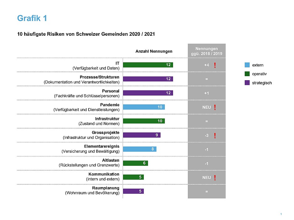 Die Pandemie hat viele Leute verunsichert. Angestellte der Gemeinde und die Bevölkerung mussten rasch informiert werden. Eine zu späte oder falsche Kommunikation führte vielerorts zu erhöhtem Aufwand. Daher ist neu auch das Thema «Kommunikation» unter den zentralen Risiken vorzufinden. Es beinhaltet sowohl die externe Krisenkommunikation gegenüber der Bevölkerung wie auch die interne Orientierung der Mitarbeitenden.