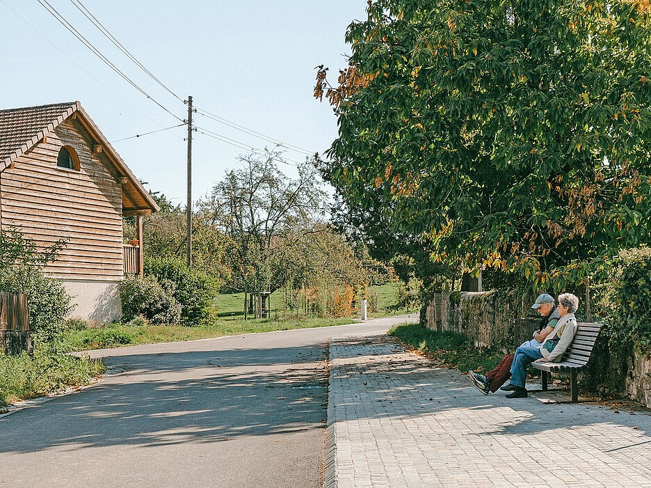 Konkret wird die Breite der Strasse verringert, um die Geschwindigkeit der Nutzenden zu senken. Bordsteine und Schikanen werden entfernt, um den Charakter von Landstrassen wiederherzustellen. Von neu installierten Bänken können Erholungsuchende den Blick in die Landschaft schweifen lassen. Das alte Zollhaus wird umgestaltet und ist nun Versammlungsraum mit Picknickplatz. Weitere Elemente wie Weidezäune, ein Holztisch mit Kalksteinbänken, ein Trinkwasserhahn oder eine Wildheckenpflanzung stärken den ländlichen Charakter der Landschaft und schützen gleichzeitig die landwirtschaftlichen Kulturen. Bis jetzt ist ein erstes, 800 Meter langes Wegstück als Teil einer Gesamtvision realisiert, in deren Zentrum ein konfliktfreies Miteinander von Einwohnerinnen und Einwohnern, Landwirtschaft und Landschaft steht.