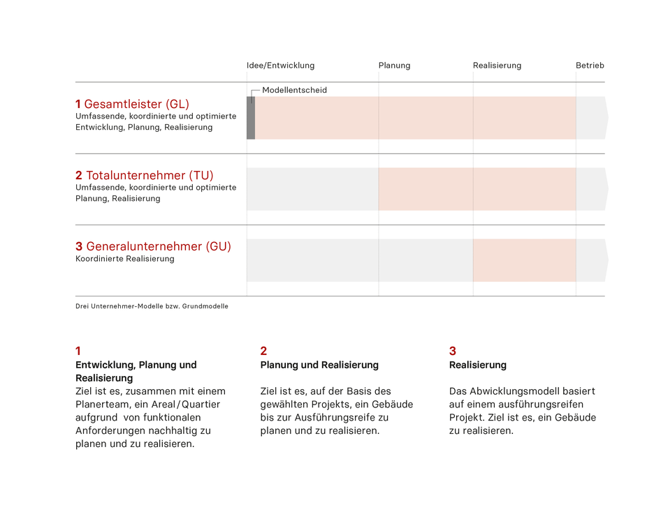Der Einsatz eines Gesamtleistungsmodells bedingt aber eine Änderungsbereitschaft aller Beteiligten. Der gemeinsame Wille, dasselbe Ziel erreichen zu wollen, ist wichtige Basis für die frühzeitige Zusammenarbeit. Der «Mut zur Lücke» kann für das Ermöglichen von Projektoptimierungen ein wichtiger Erfolgsfaktor sein. Eine frühe und umfassende Interessenabwägung ist für eine möglichst hohe Planungssicherheit für alle Beteiligten massgebend. Auch brauchen die Akteure ein gemeinsames Verständnis von Qualität. Qualität ist ein übergeordnetes Ziel, das über den Lebenszyklus eines Objektes angestrebt werden muss. Es ist wichtig, dass dabei die Erwartungen vom Auftraggeber an die verschiedenen Qualitätskomponenten so kombiniert werden, dass sie zu einem optimalen Resultat führen.